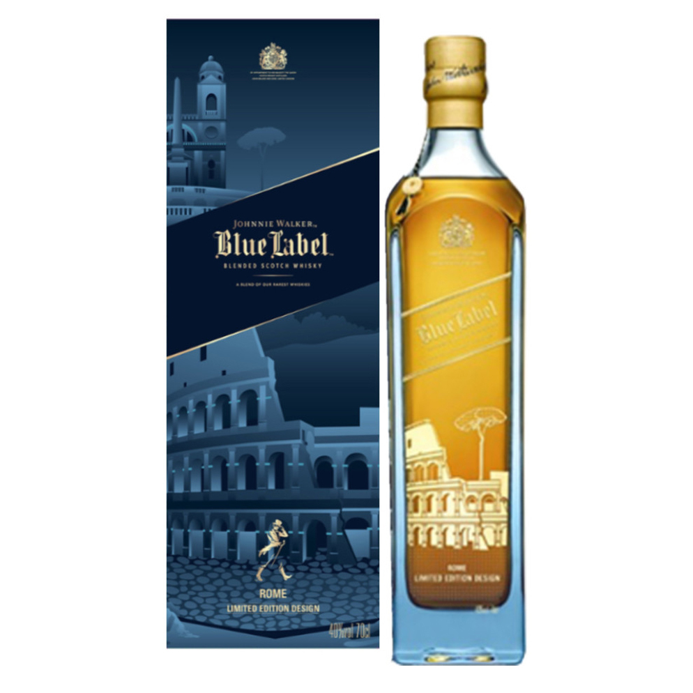A Limited Edition bottling of Johnnie Walker Blue Label with a cityscape of Rome on the bottle and box. The design captures the essence of the vibrant city of Rome.