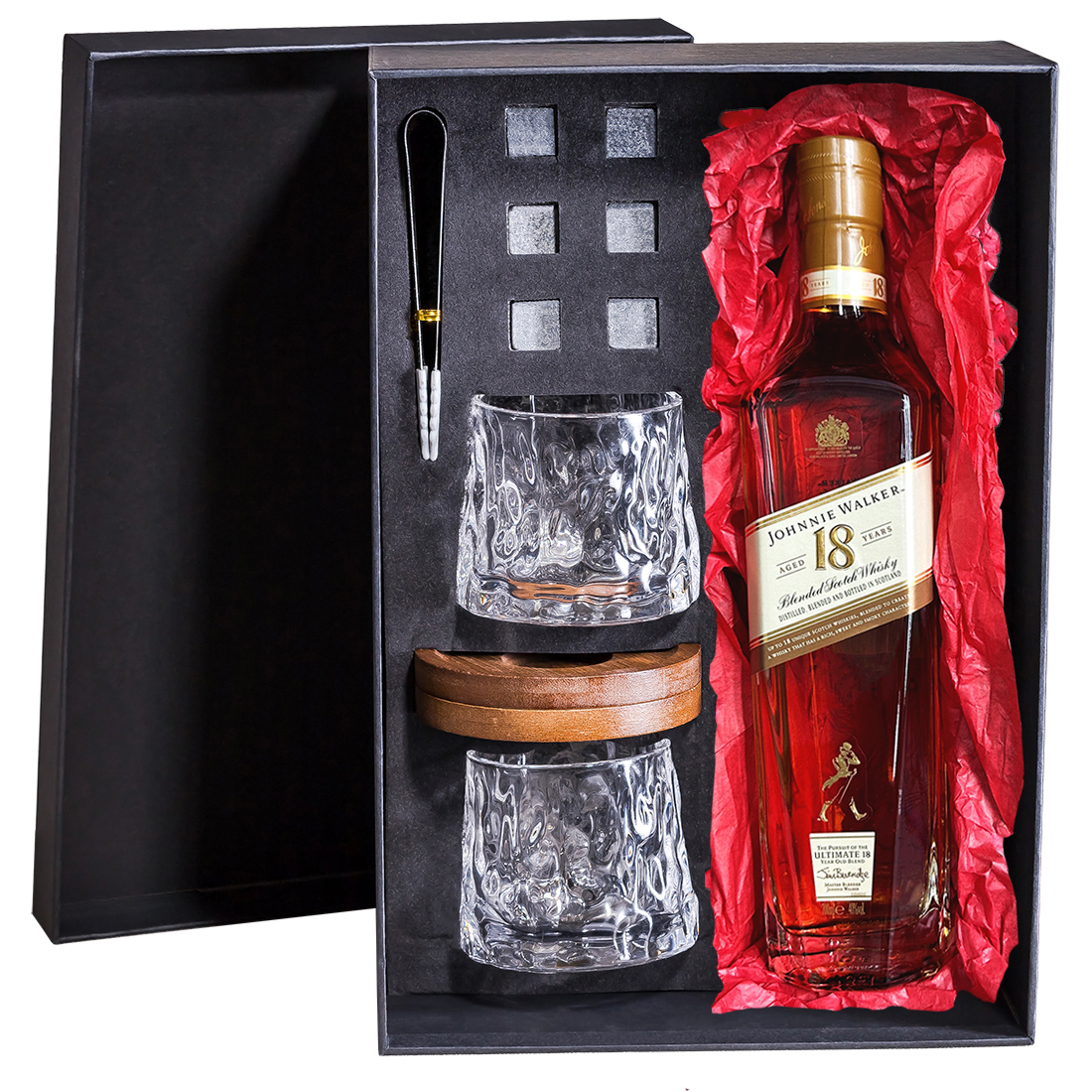 Johnnie Walker Ultimate 18 Year Old with gift box including 2 spinning tumblers, 2 wooden coasters and 6 stone ice cubes. The shape of the tumblers and coasters will allow them to spin.